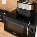 This apartment comes with tea and coffee making equipment and a mini-kitchen featuring a microwave, a refrigerator, and kitchenware.